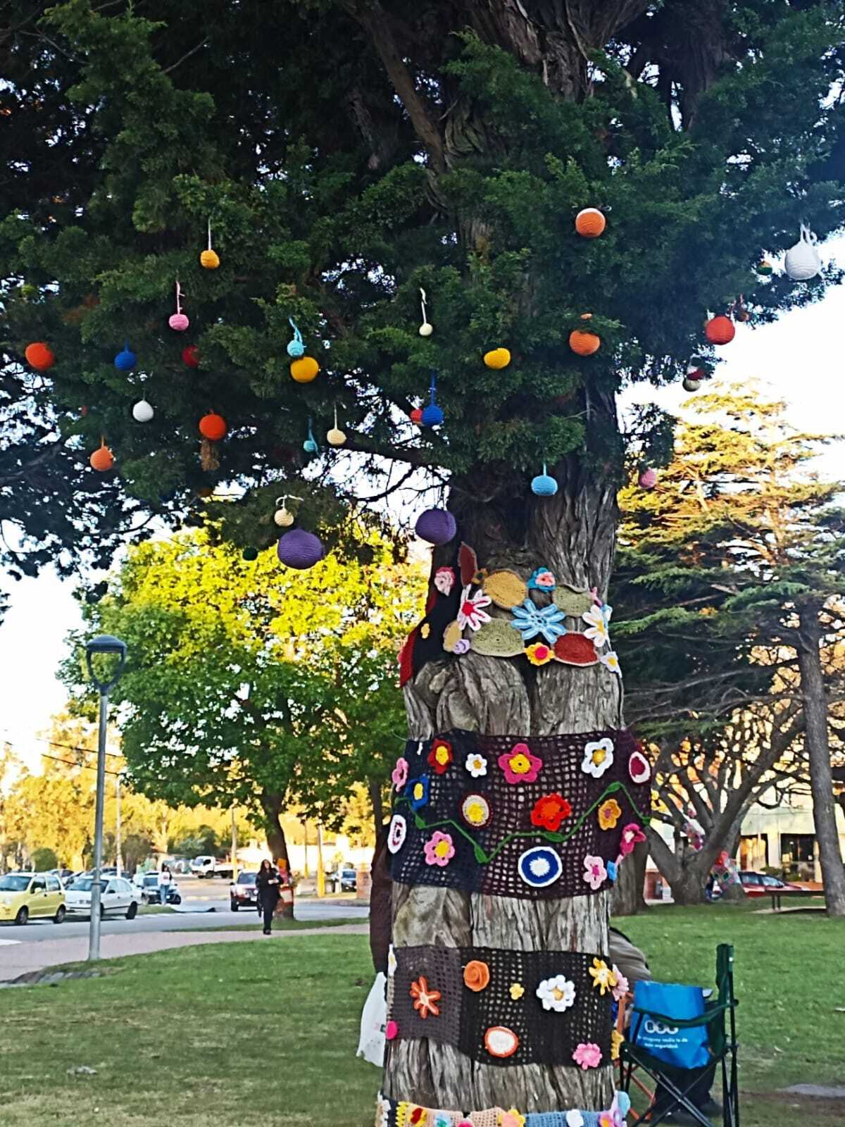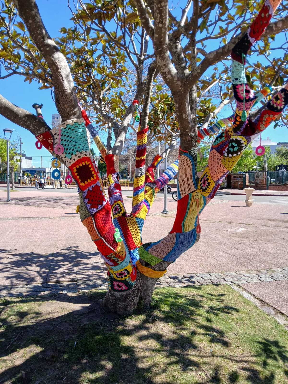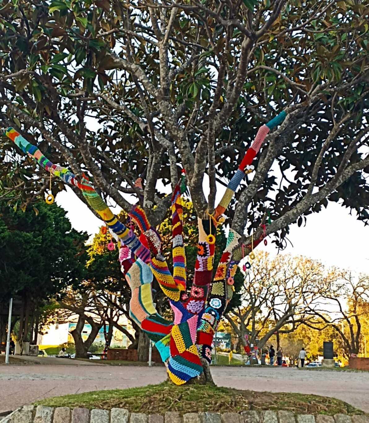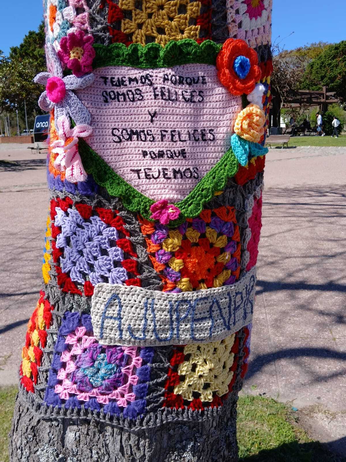 fotos de la Intervención urbana textil en Plaza Artigas que hizo nuestro grupo de tejedoras, 22 asociadas con su profesora Virginia Aparicio.